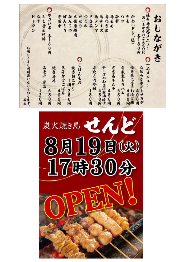 「炭火焼き鳥 せんど」様より、オープンに伴う印刷物のご依頼をいただきました。