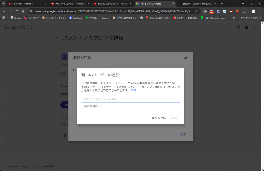 YouTubeチャンネルを複数人で管理するためには、YouTube Studioから管理・運営を行うユーザーを招待し、追加します。